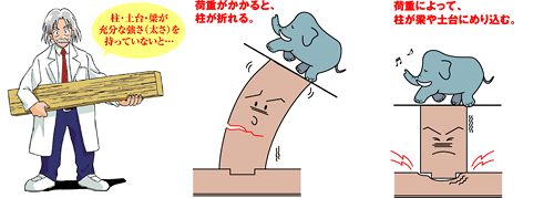 梁と同様に、柱にも力はかかります。力を受けた時に柱が折れないよう、また、土台・梁にめり込んだりしないよう、必要な強さを持った柱や土台・梁が配置されているかをチェックします。